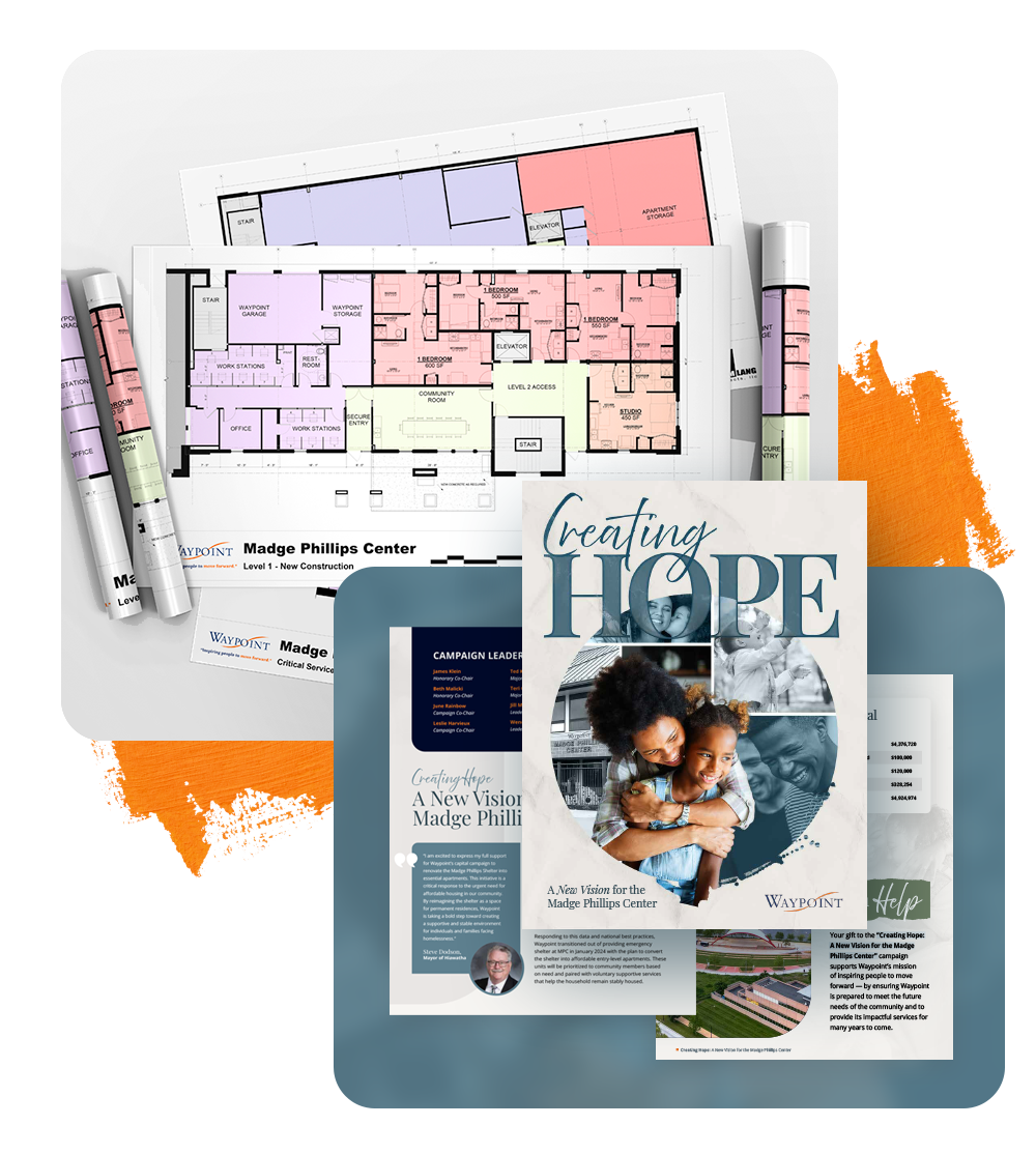 Waypoint launched a $4.9 million capital campaign, "Creating Hope: A New Vision for the Madge Phillips Center," to strengthen the community’s efforts to end homelessness. As the local leader in homeless and housing services, Waypoint is securing the future of cost-efficient, high-impact housing solutions. This campaign will support the historic renovation of the Madge Phillips Center Shelter into the Madge Phillips Apartments, create a new space for the Coordinated Entry Call Center Program, and enhance private Housing Services offices.